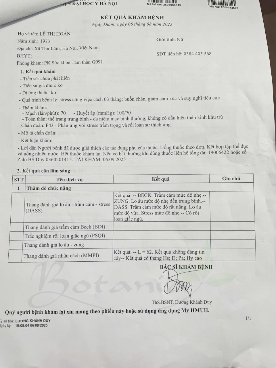 Kết quả khám bệnh của chị Hoàn tại BV