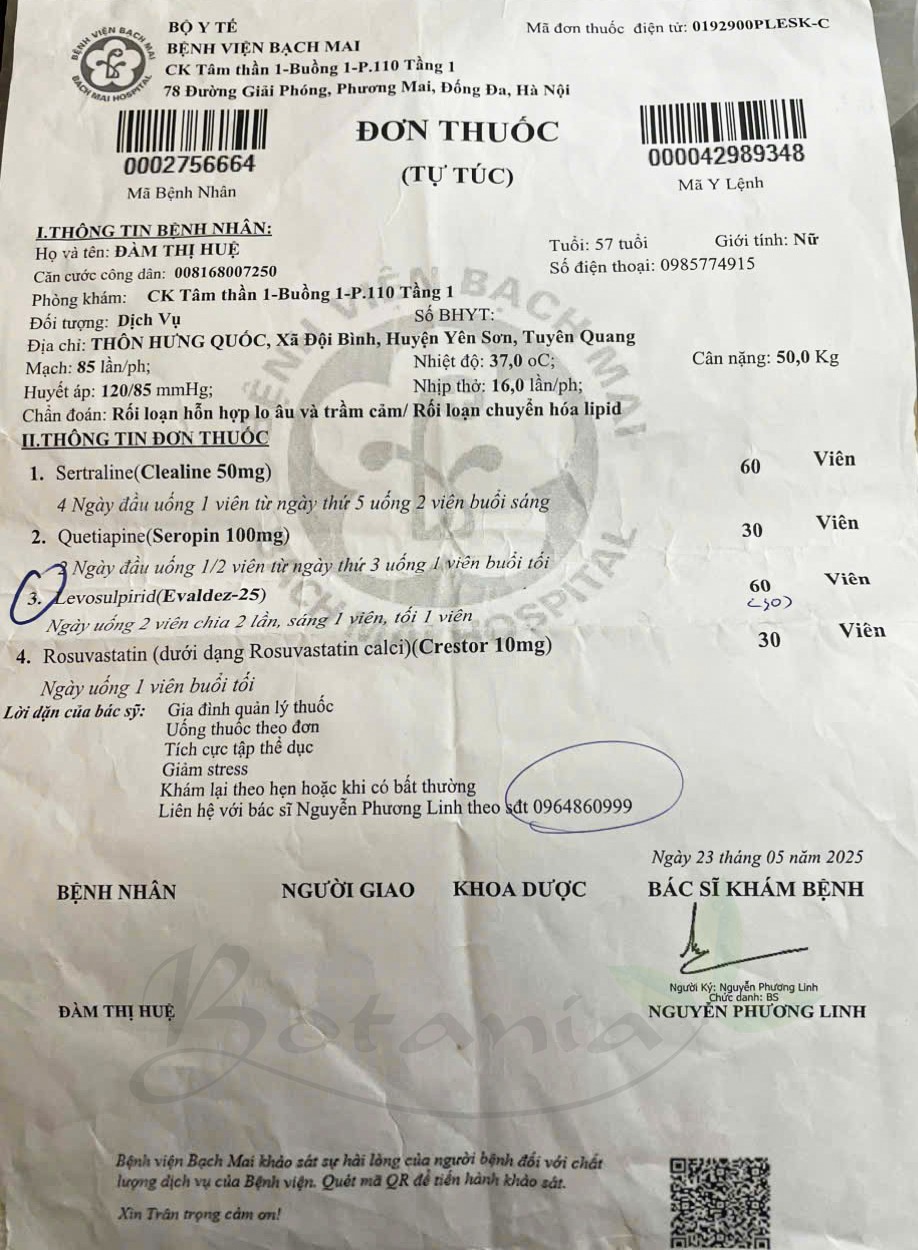 “Có chứ cháu” – cô Huệ nói: “Cô đi khám ở trên tỉnh này thì không ra được bệnh, họ chỉ bảo cô bị rối loạn nội tiết, tiền mãn kinh. Uống thuốc theo đơn nhưng không cải thiện. Cô mới quyết định đi bệnh viện Bạch Mai khám, sau khi kể rõ tình trạng thì bác sĩ chuyển cô sang khoa Tâm Thần. Lúc đó cô còn ngạc nhiên, sao mình lại phải vào khoa này nhỉ?. Sau khi thăm khám, làm bài test đủ các kiểu, bác sĩ kết luận cô bị rối loạn chuyển hóa, rối loạn lo âu, trầm cảm và kê đơn thuốc tây. Đêm đầu tiên cô uống thuốc tây mà như người say thuốc, nằm mê mệt không dậy nổi, con gái soi camera không thấy mẹ đâu phải nhờ người thân chạy qua xem có chuyện gì cơ mà. Về sau tình trạng này có đỡ hơn nhưng nói chung cô vẫn thấy người quay quay, sáng dậy chân tay rã rời, mệt mỏi không muốn dậy. Hết thuốc độ 2 hôm là triệu chứng trở lại ngay, không sót triệu chứng nào”.